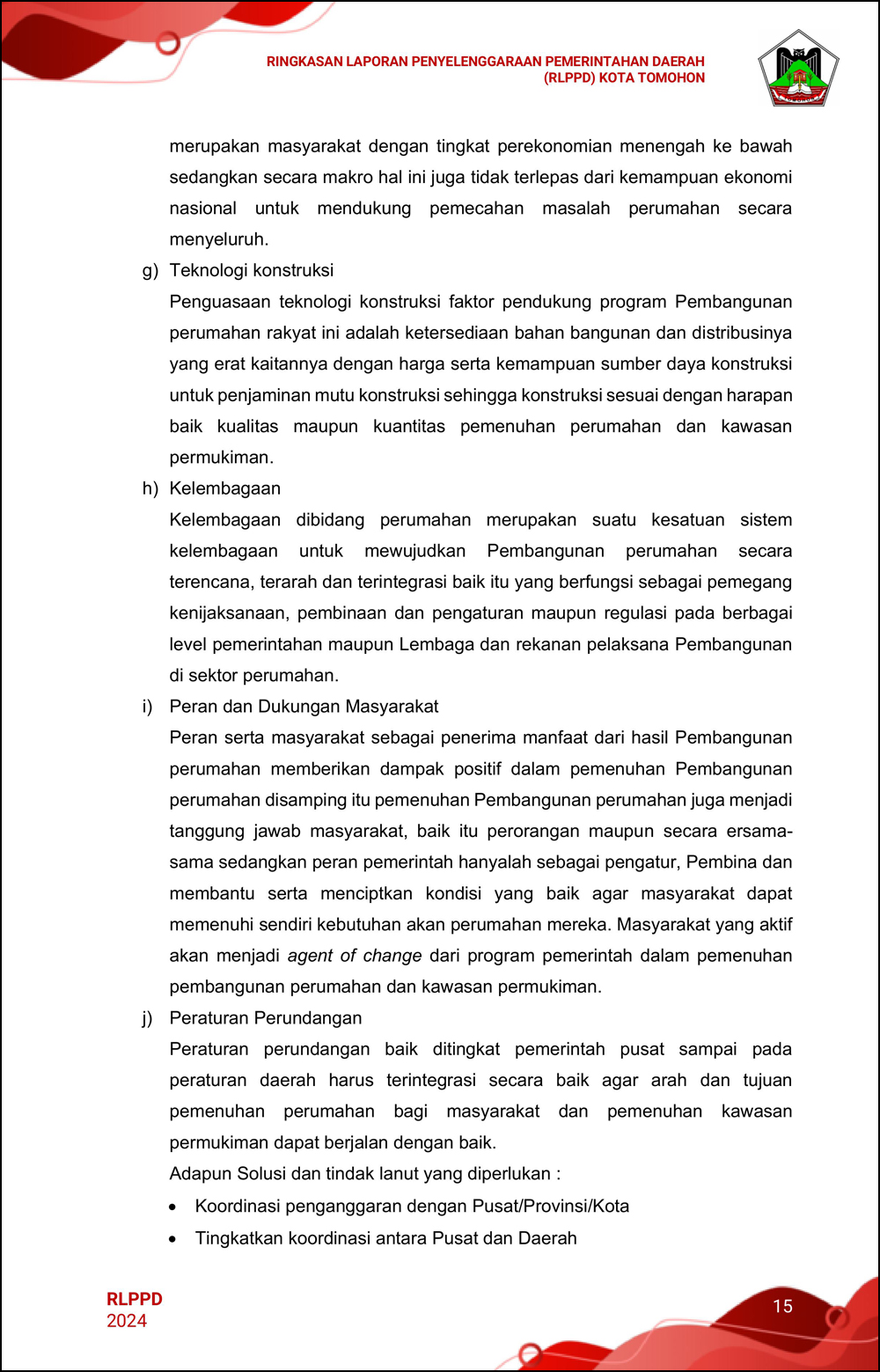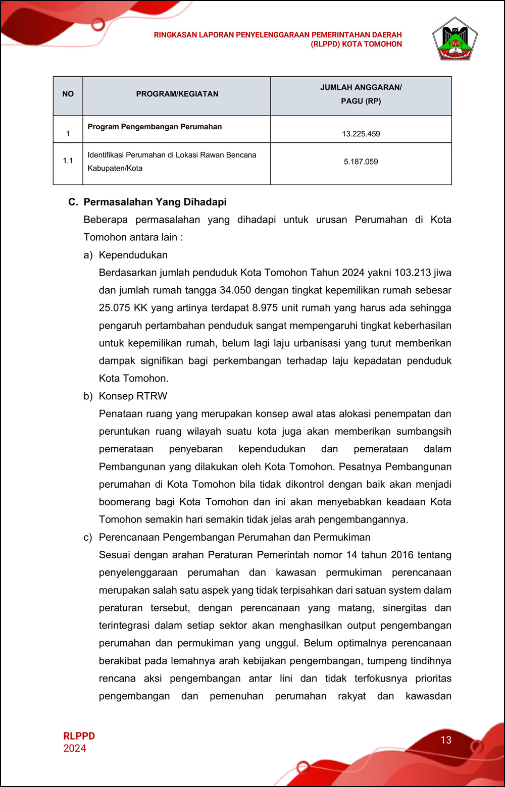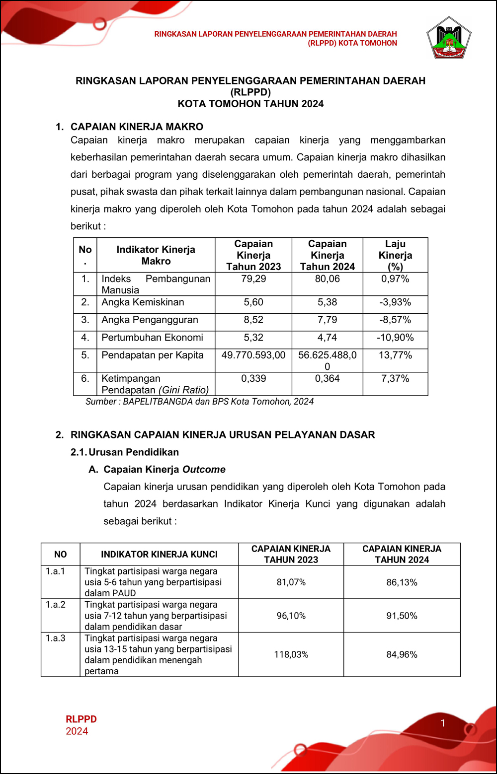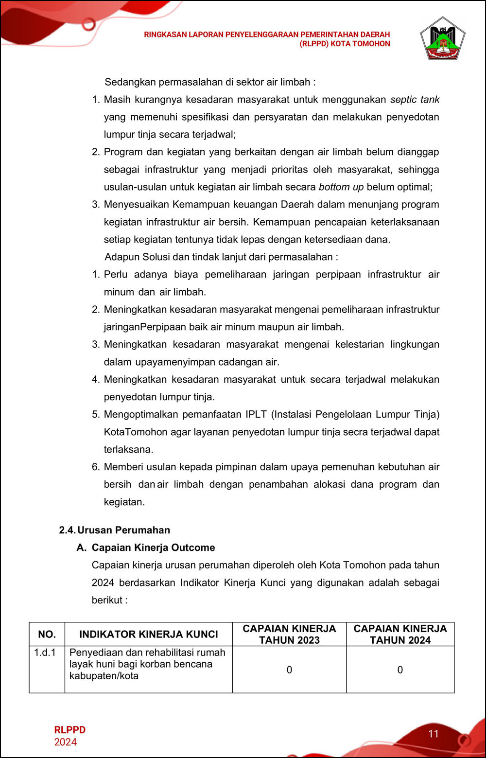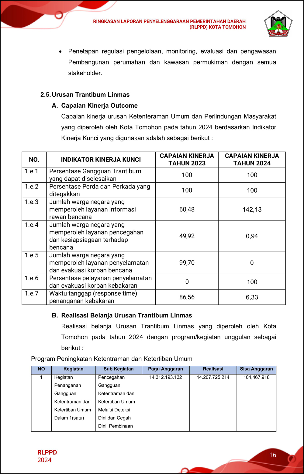 RLPPD Tahun 2024 ini berisi laporan kinerja Pemerintahan Kota Tomohon selama satu tahun.
